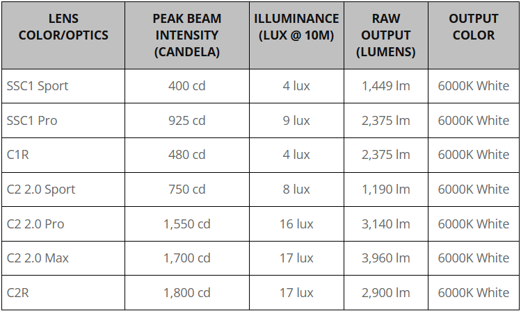 Sport, Pro or Max. Both the SSC1 and C2 2.0 LED pods are available in Sport and Pro power levels. Both options use high-intensity LED emitters, and TIR optics for unmatched focus and overall output. However, the Pro option offers a noticeable boost in total power.