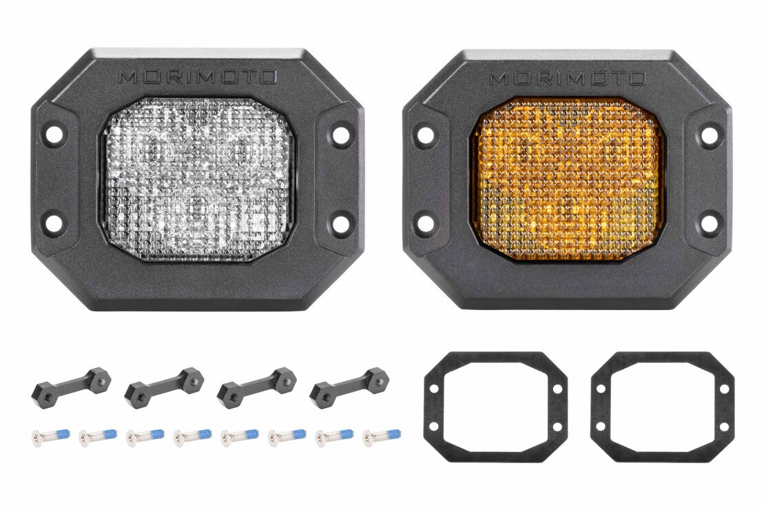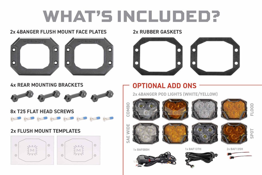 The Flush Mount Morimoto 4Banger LED Pods — a revolutionary lighting solution designed to elevate your driving experience. These pods are versatile and stylish, thanks to their flush mount brackets that make installation on any flat surface a breeze. If your application is fitted with flush mount lights, these share the same mounting template making replacement as simple as remove-and-replace!