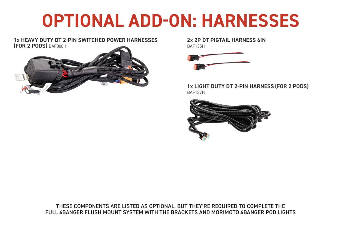 Power Up: The Morimoto 4Banger LED Pods have been developed from the ground up to set a new standard in their segment, and the same goes for the optional wire harness. If you want the best, bingo. Not one component on the harness was overlooked for the sake of cost or simplicity. Triple sealed proprietary 4-pin relay with hanger. Proprietary over-molded inline fuse holder with 20A mini fuse. DT06-2S female outputs with dual seals. Stainless steel power and ground terminals. Proprietary M-Spec push button switch with Yellow-LED backlight.
