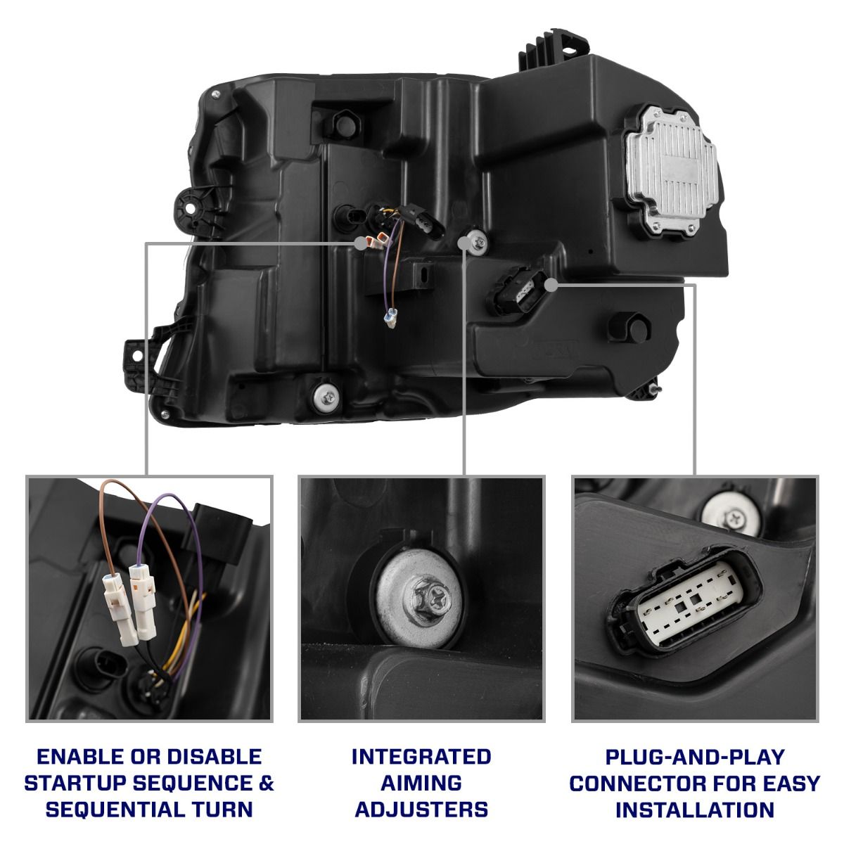 Sequential Turn Signal. These headlights feature a modern sequential LED turn signal that activates in a smooth sweeping pattern when signaling, adding a modern look compared to the factory turn signal. The sequential function can be disabled during installation if preferred, for a clean, static turn signal.