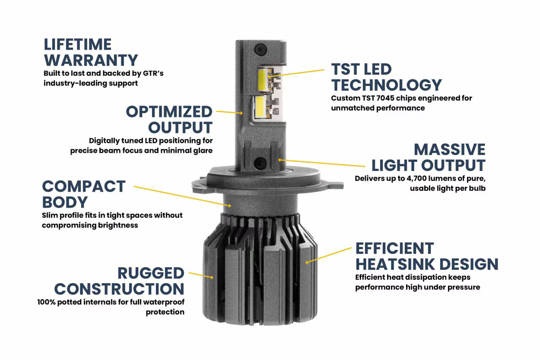 The Best: While so many others use Philips or CREE LED chips, GTR went with a custom TST 7045 chipset option to ensure better results. Those results show through to the finished product too thanks to digitally optimized LED positioning that most closely matches the original filament tolerances. Combining these features is the key to getting all the light from the source to the reflector surface and ultimately onto your target without wasted lumens and glare all over.